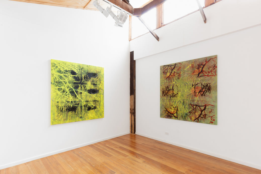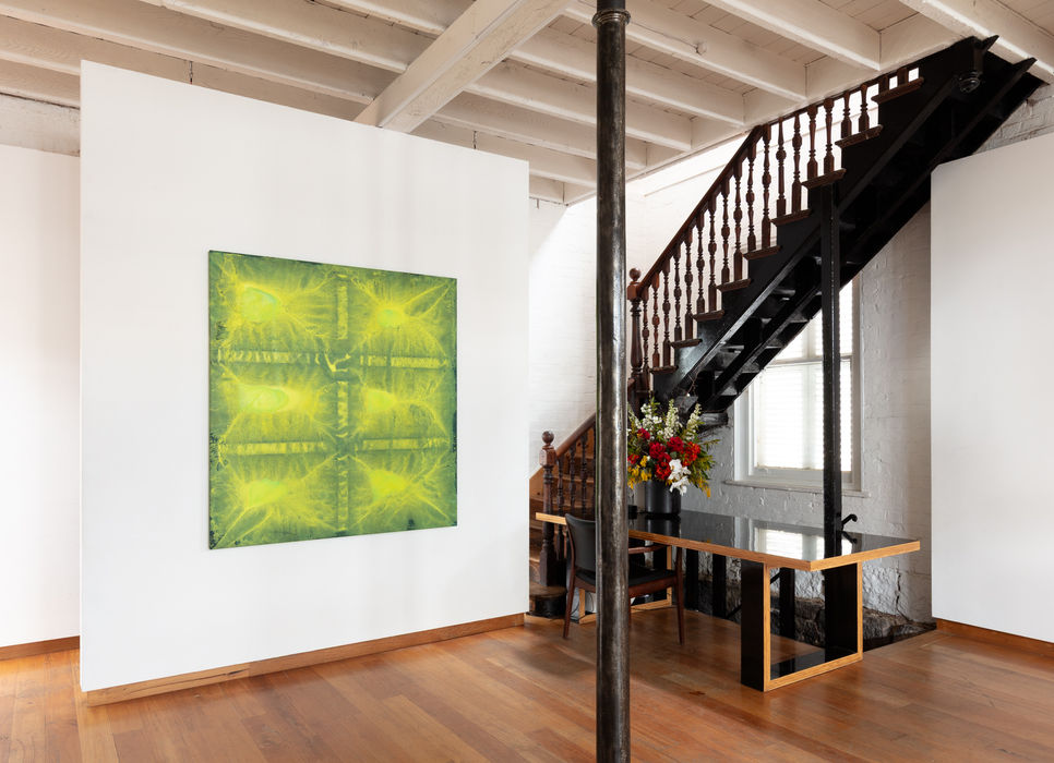 Moving beyond the figurative and towards the elemental, Baker allows paint to find its own image. The resulting works reflect a dialogue between the organic flow of pigment and the quiet imposition of the canvas's physical framework - its weave, grain, and the subtle shadow of stretchers beneath. These ghostly impressions speak not only to the materials themselves, but to the unseen systems that shape our experience of art, space, and meaning.